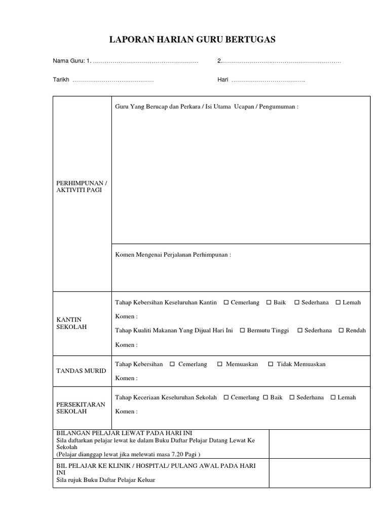 Recent Posts 2021 192. Buku Laporan Mingguan Guru Bertugas Perhimpunan Softcopy - PowerPoint Berikut kami kongsikan softcopy contoh Buku Laporan Mingguan Guru. Merekodkan semua kes disiplin yang telah diambil tindakan daripada borang disiplinbuku laporan disiplin kelas ke dalam sistem sahsiah.